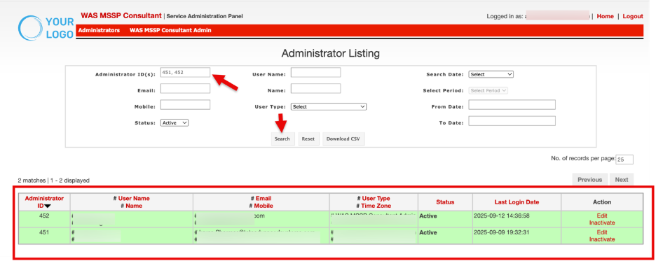 - To filter based on Administrator ID, enter the ID(s), and click Search