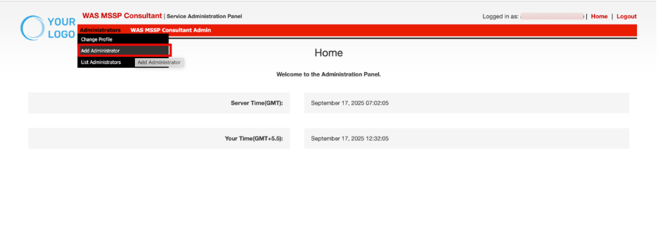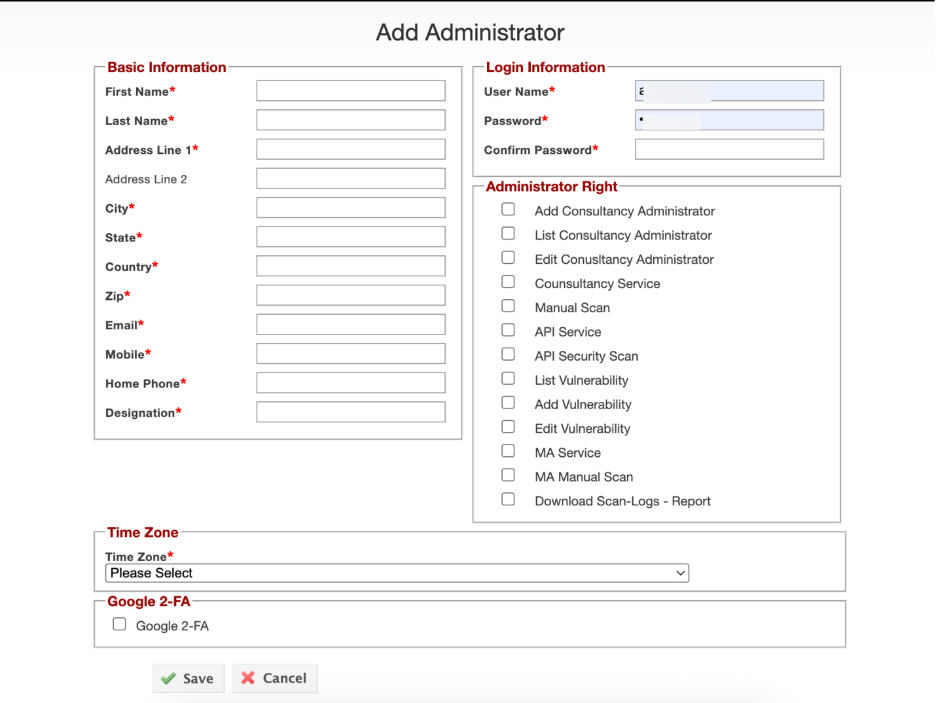 The Add Administrator section enables MSSP administrators to create new admin accounts, define their access rights, and enforce security configurations. This ensures centralized role-based management within the VAPT consultant platform.