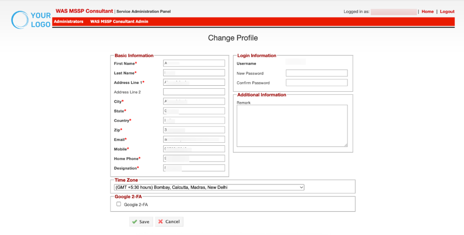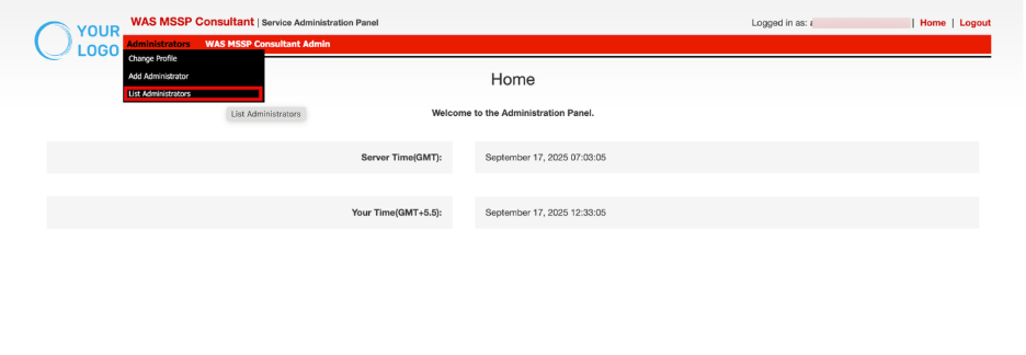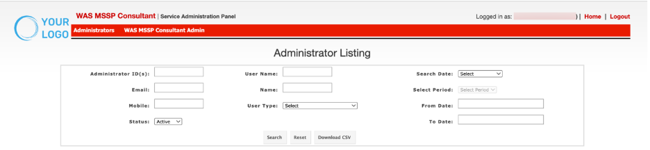 The Administrator section provides centralized controls to manage consultant administrators within the MSSP portal. It includes options to update profiles, add new administrators, and view or manage the list of existing administrators with defined access rights.
