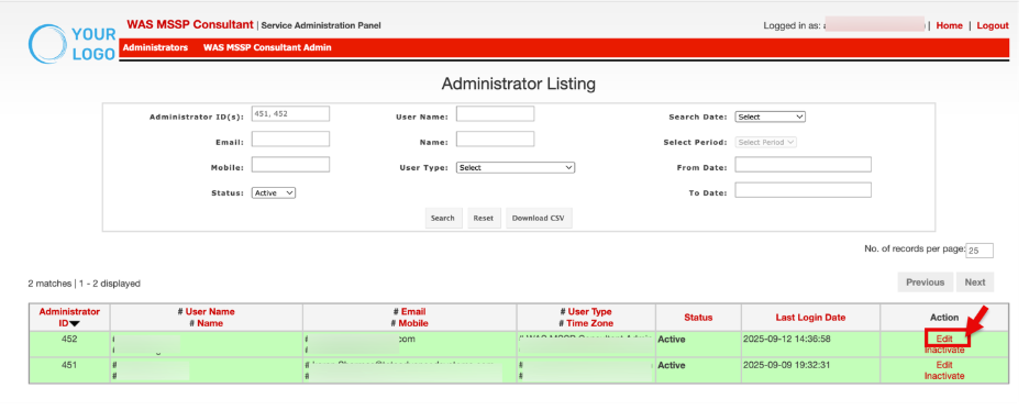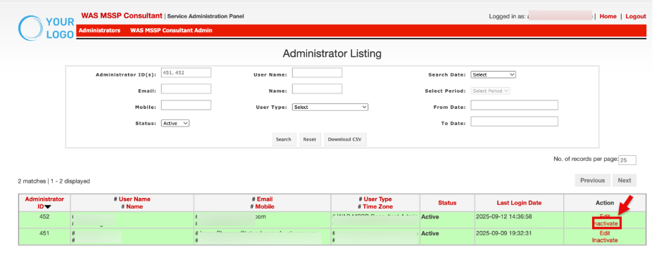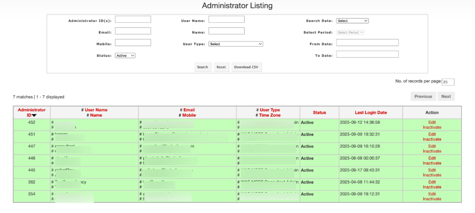 - Click Download CSV to export the filtered administrator list for offline analysis.