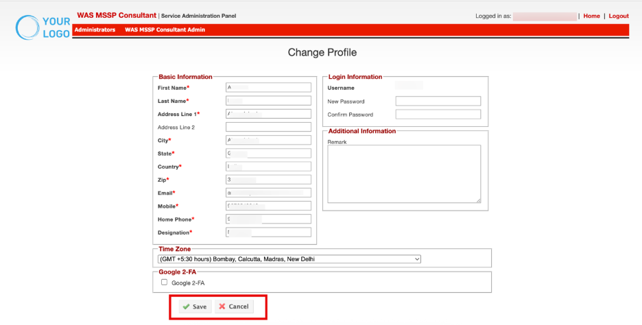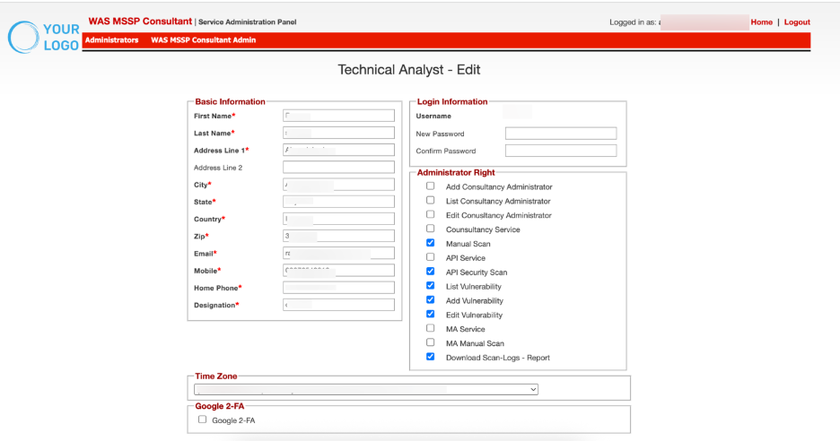 User Type Time Zone | Role and selected time zone within panel. Specifies the type of admin (for example, MSSP Consultant Admin) and the user's time zone for reporting and scheduling accuracy. |
