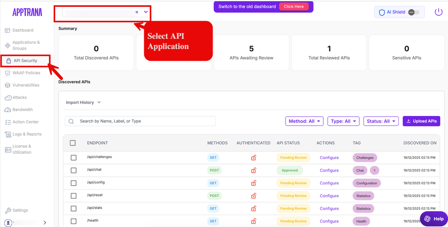Provides a quick view of API coverage under AI Shield, helping verify AI endpoint tagging and protection status.