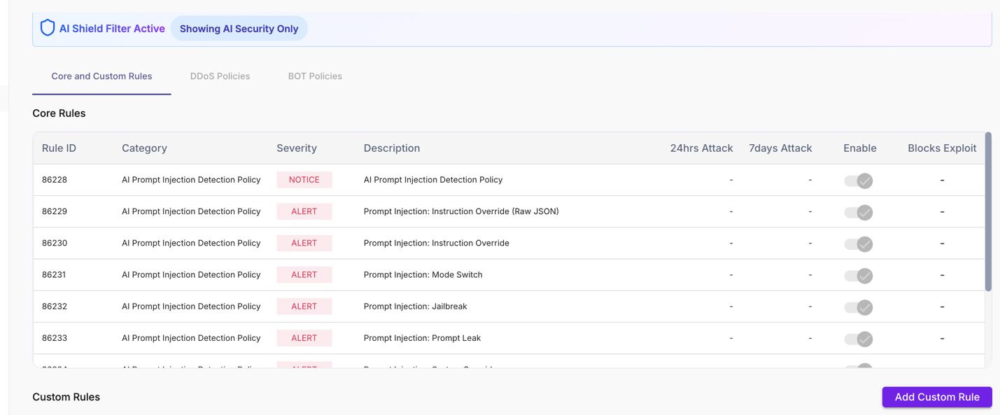 - System-defined AI Shield rules remain enabled regardless of custom rules.