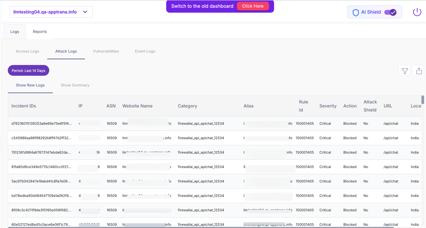 Attack Logs capture only malicious or policy-violating requests that triggered WAAP or AI Shield enforcement. This view is used for security investigation and incident analysis.