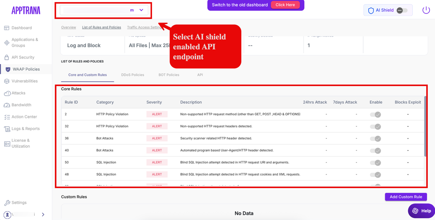 When AI Shield is enabled, Core rules associated with endpoints tagged as AI are displayed in the AI Shield view
