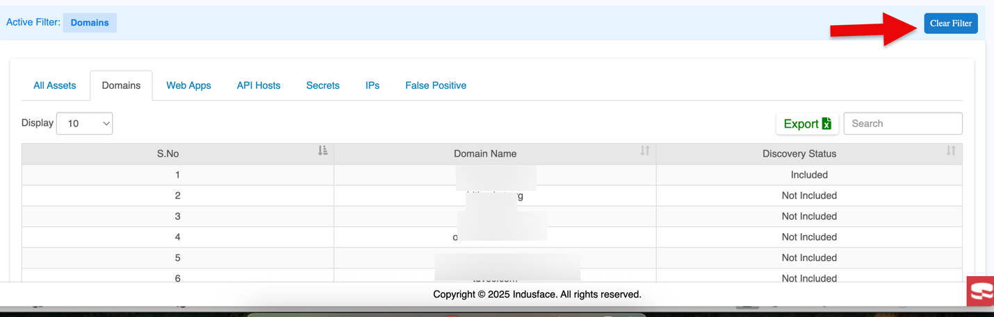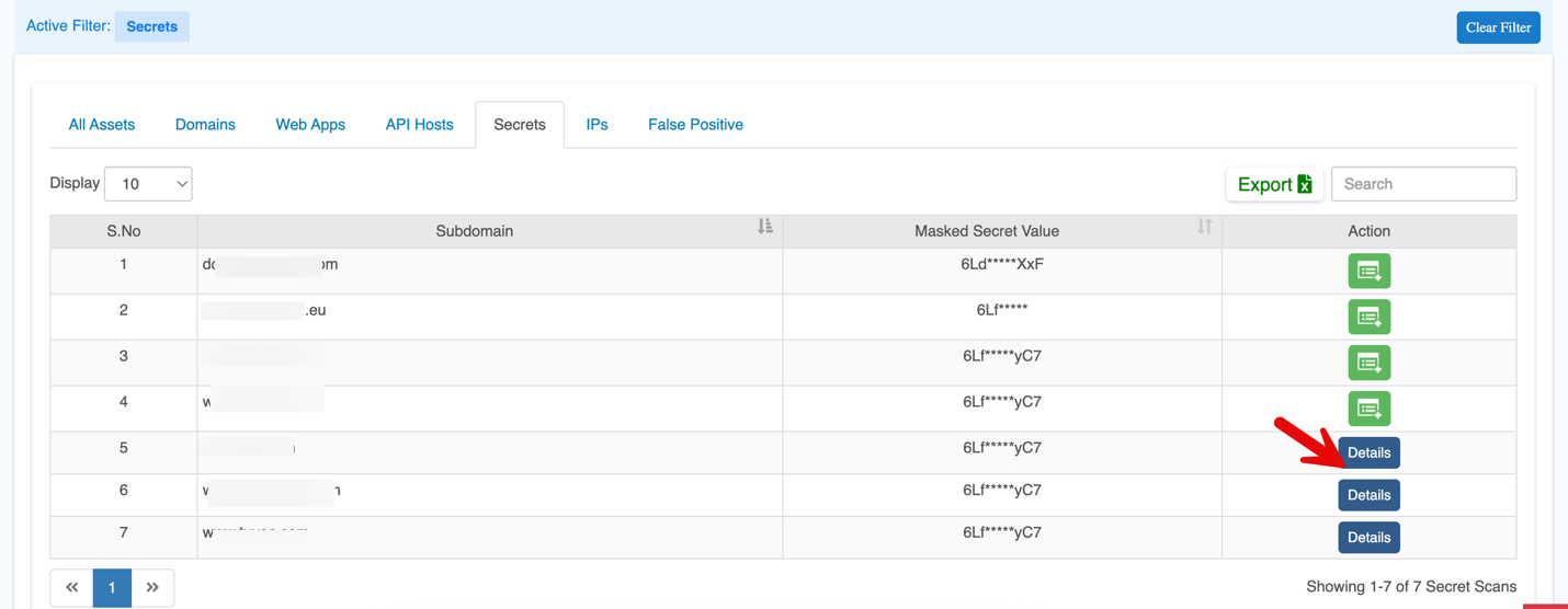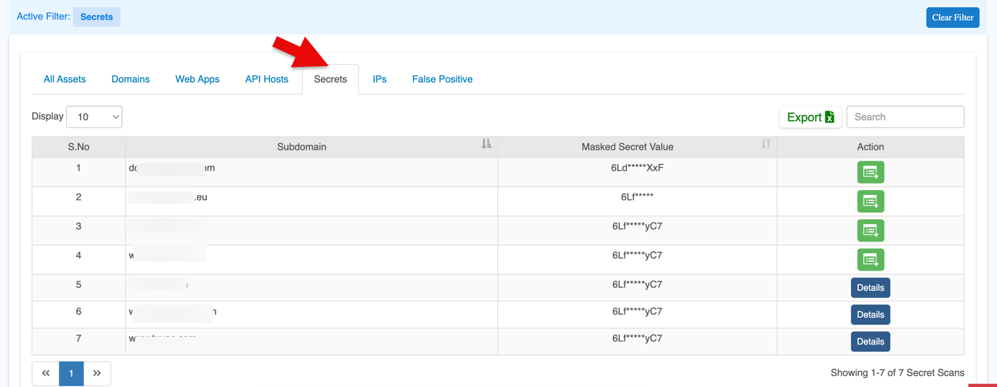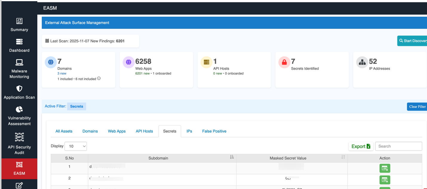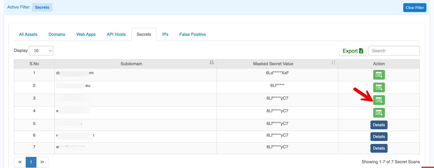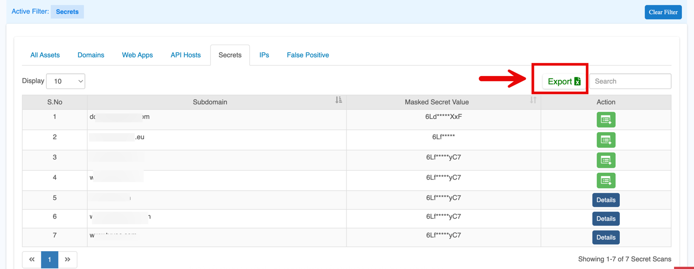 Allows to export the secrets or asset findings into CSV format for further reporting or analysis. The exported report will include secrets only for the onboarded sub-domains.