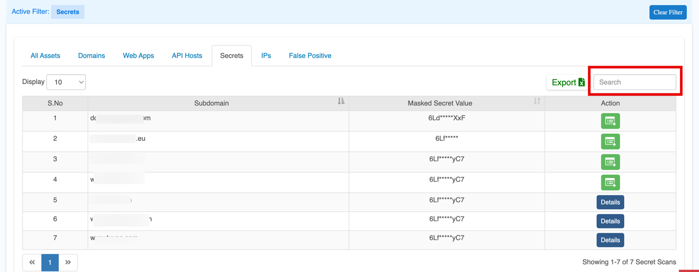The search bar helps you quickly find specific assets, secrets, or vulnerabilities by entering keywords or applying filters (e.g., subdomains, severity level).