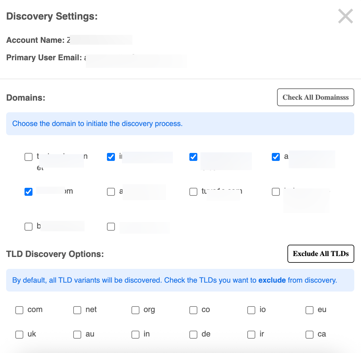 This section allows you to select or exclude specific TLDs (e.g., .com, .net, .org, etc.) during the discovery process.