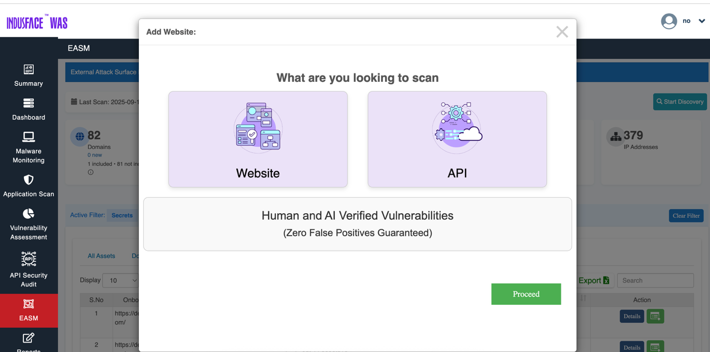 | All Assets | Displays a comprehensive list of all assets that are being monitored, including domains, web apps, and other resources where vulnerabilities or secrets have been detected. |